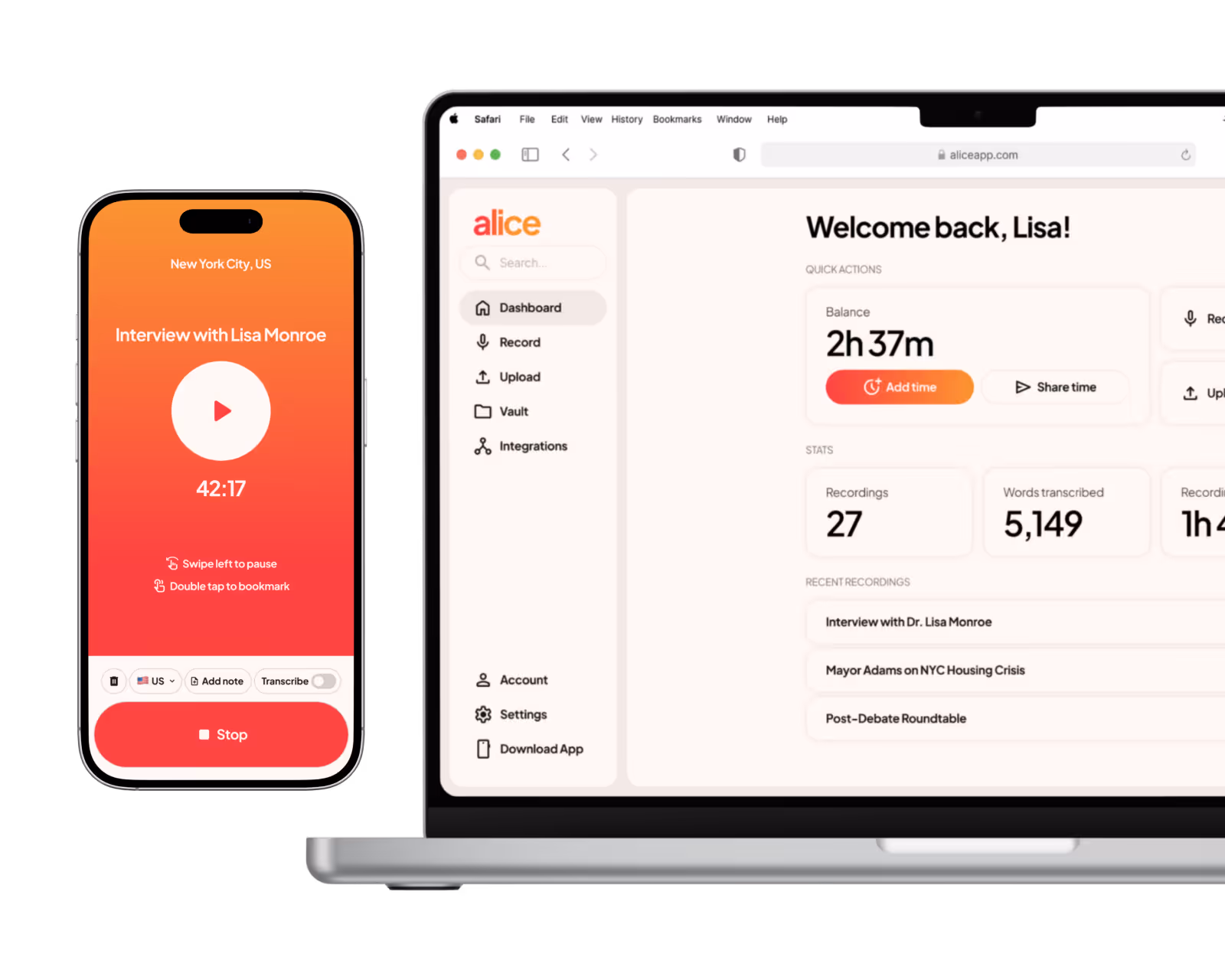 Alice converts hours of audio into high-accuracy transcripts in seconds. Powered by cutting-edge AI, it delivers instant, private results the moment you hit stop.